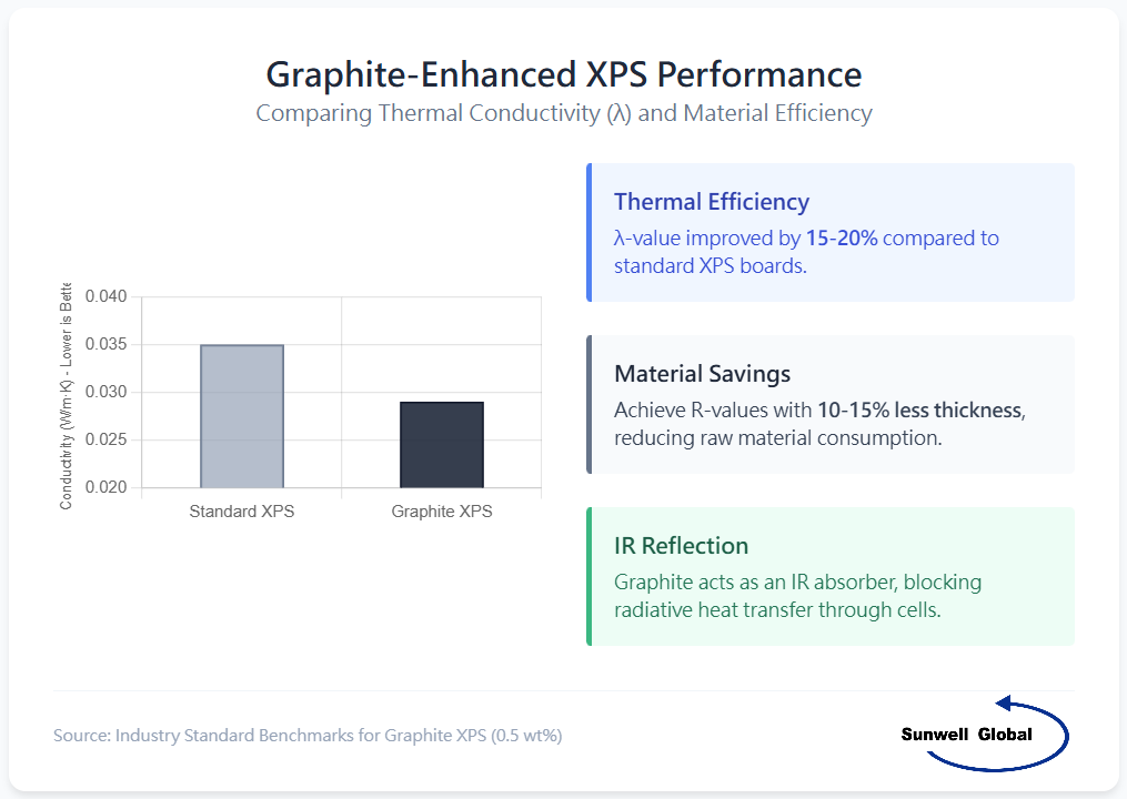 By acting as an infrared (IR) absorber and reflector, graphite lowers the thermal conductivity (λ-value) of XPS boards. In commercial production, graphite-added XPS typically delivers a 10–20% improvement in λ-value compared to standard XPS.