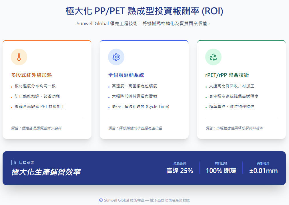 在現代塑膠包裝產業中,從傳統製造轉向高效率製程的驅動力不僅僅是成本,更是為了應對全球能源波動與更嚴苛的材料標準。對於 PP 與 PET 加工業者而言,深入理解真空熱成型過程中的熱動力學,是邁向長期營運穩定性的第一步。